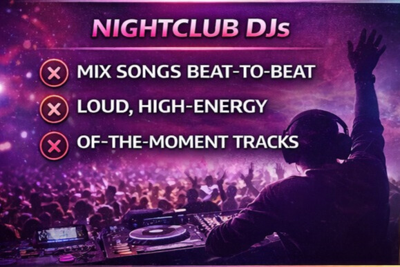 No, we use customized playlists. This keeps pricing affordable while still delivering great energy and smooth transitions.